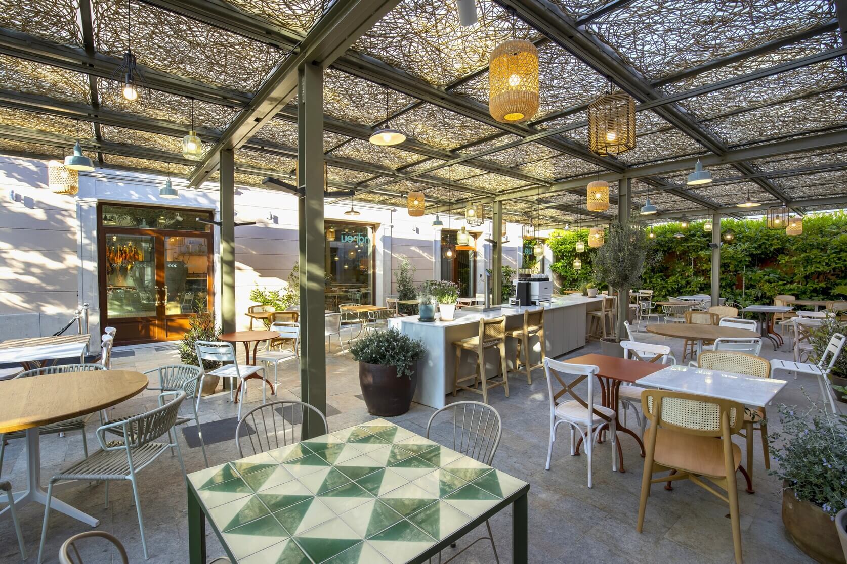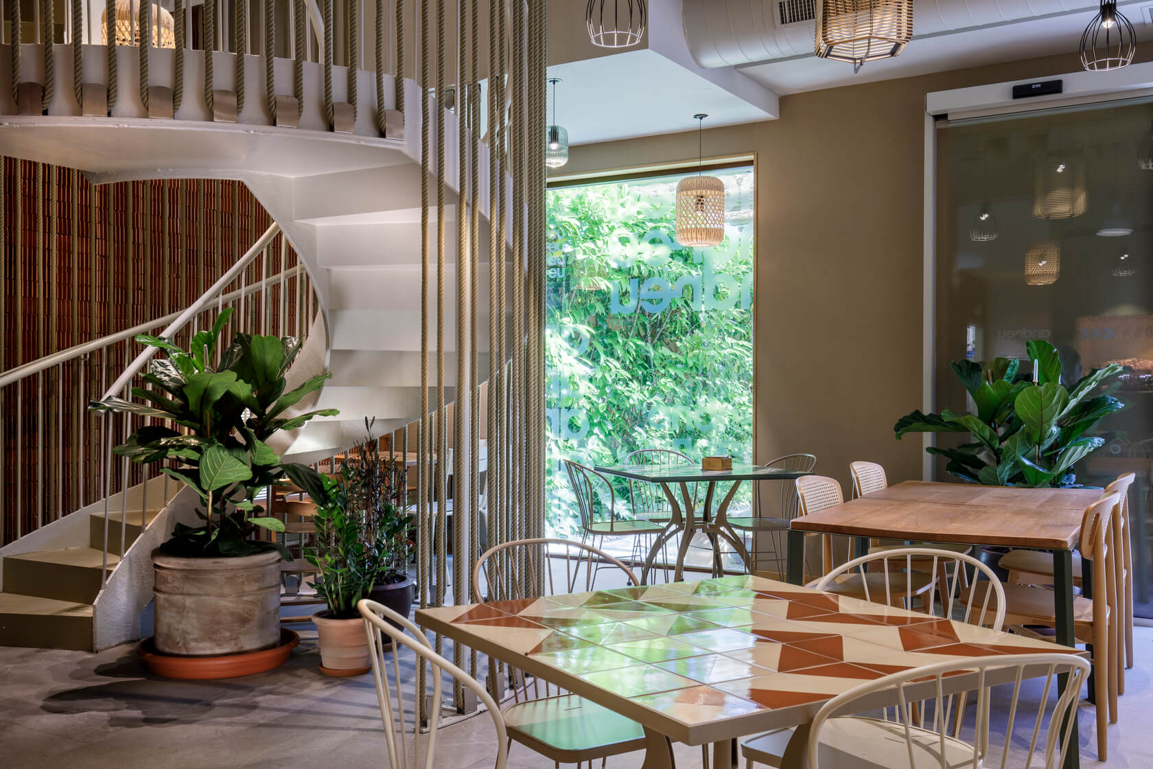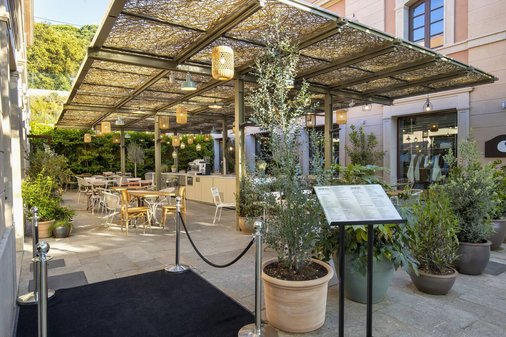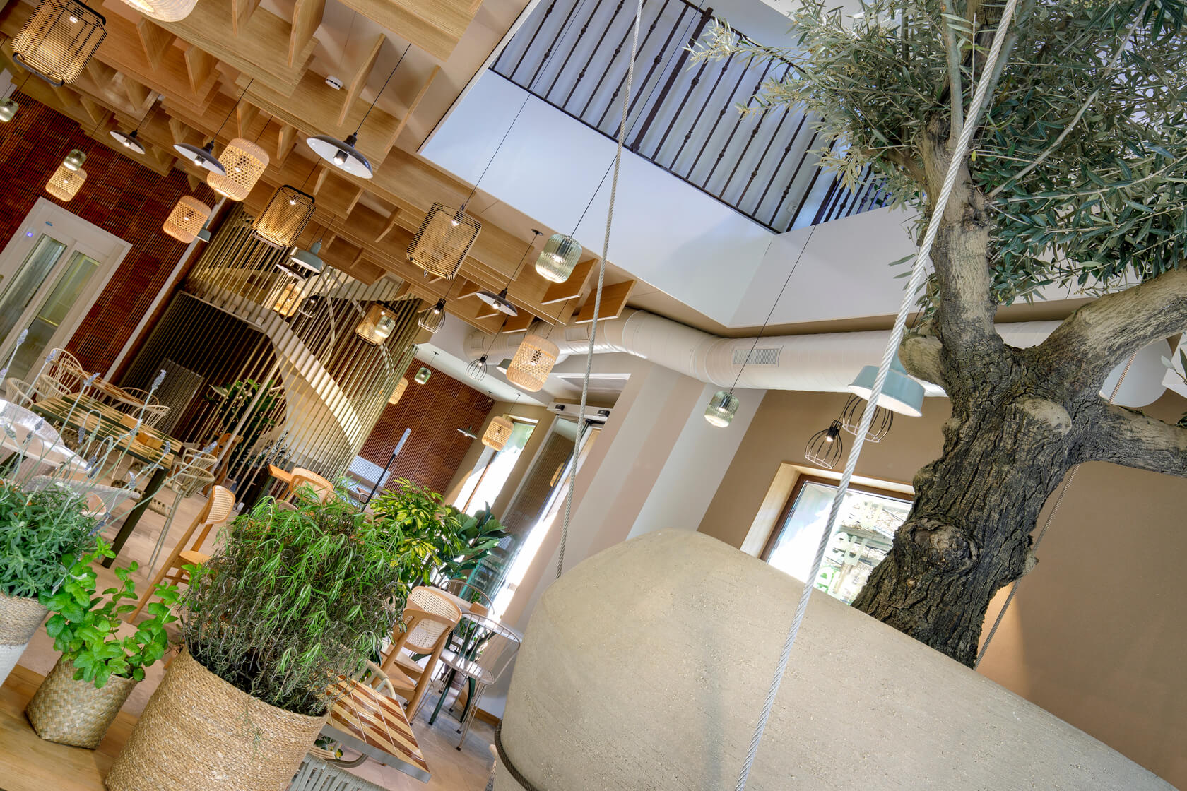 El disseny es centra en la fusió entre interior i exterior, creant una continuïtat visual que convida als visitants a descobrir ambdós espais. Grans finestrals, vegetació integrada i elements naturals reforcen aquesta connexió amb l’entorn, aportant frescor. La integració de la naturalesa en el disseny interior es materialitza amb plantes ornamentals i textures orgàniques que transformen l’ambient en un oasi sensorial.